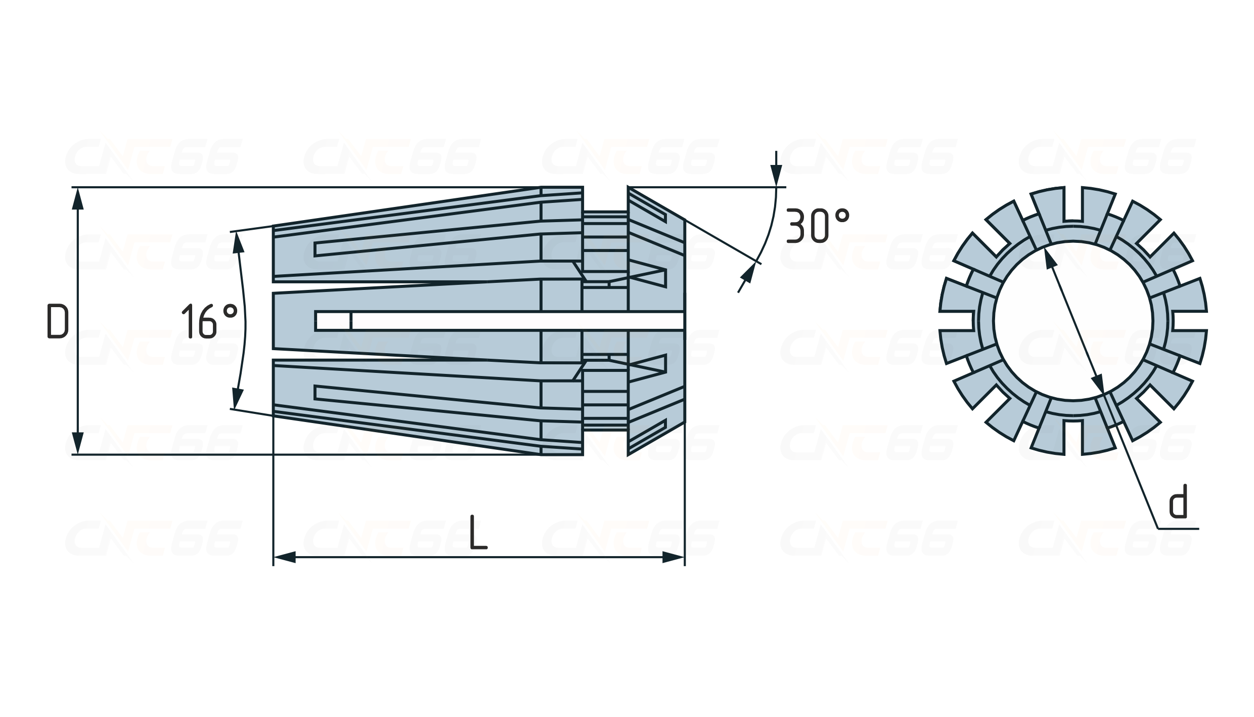 Цанги ER32 предназначены для фиксации инструмента с цилиндрической формой хвостовика диаметром 2-20 мм. Конструктивно представляет собой конус усеченной формы со сквозным отверстием. Надежная фиксация инструмента обеспечивается двумя зонами прижима. Среднее отклонение концентричности (биение) составляет ≤0,015 мм (2 класс).