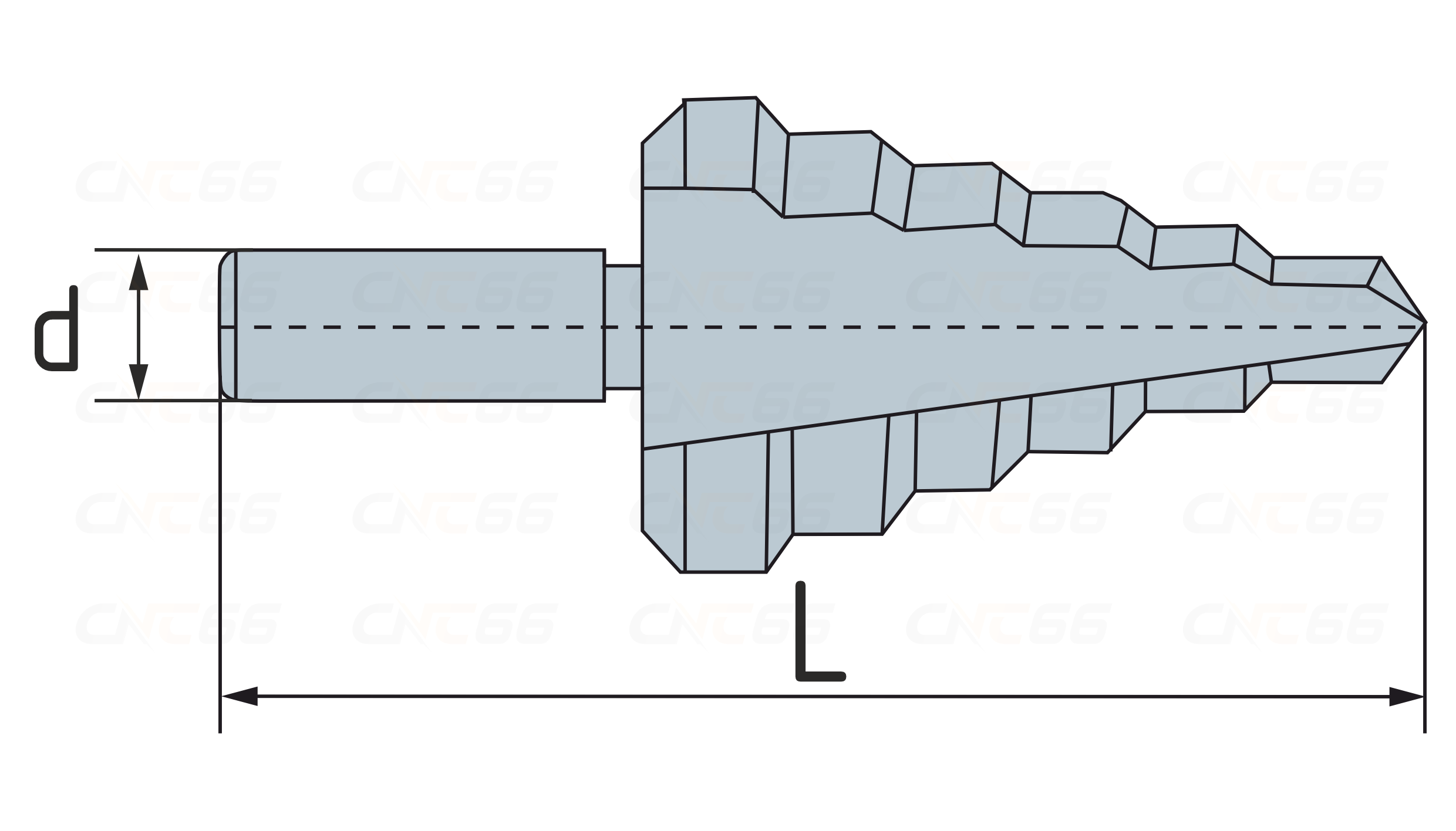 Ступенчатые сверла из быстрорежущей стали серии SSHS используются для изготовления отверстий в заготовках из листового металла. Конструктивно данный инструмент состоит из рабочей части в виде набора цилиндрических поверхностей со ступенчатым переходом и хвостовика Triangle shank. На рабочей части расположена прямая стружечная канавка, которая при пересечении с цилиндрическими поверхностями образует режущую кромку инструмента. Для дополнительной защиты сверла применяется покрытие из нитрида титана (TiN).