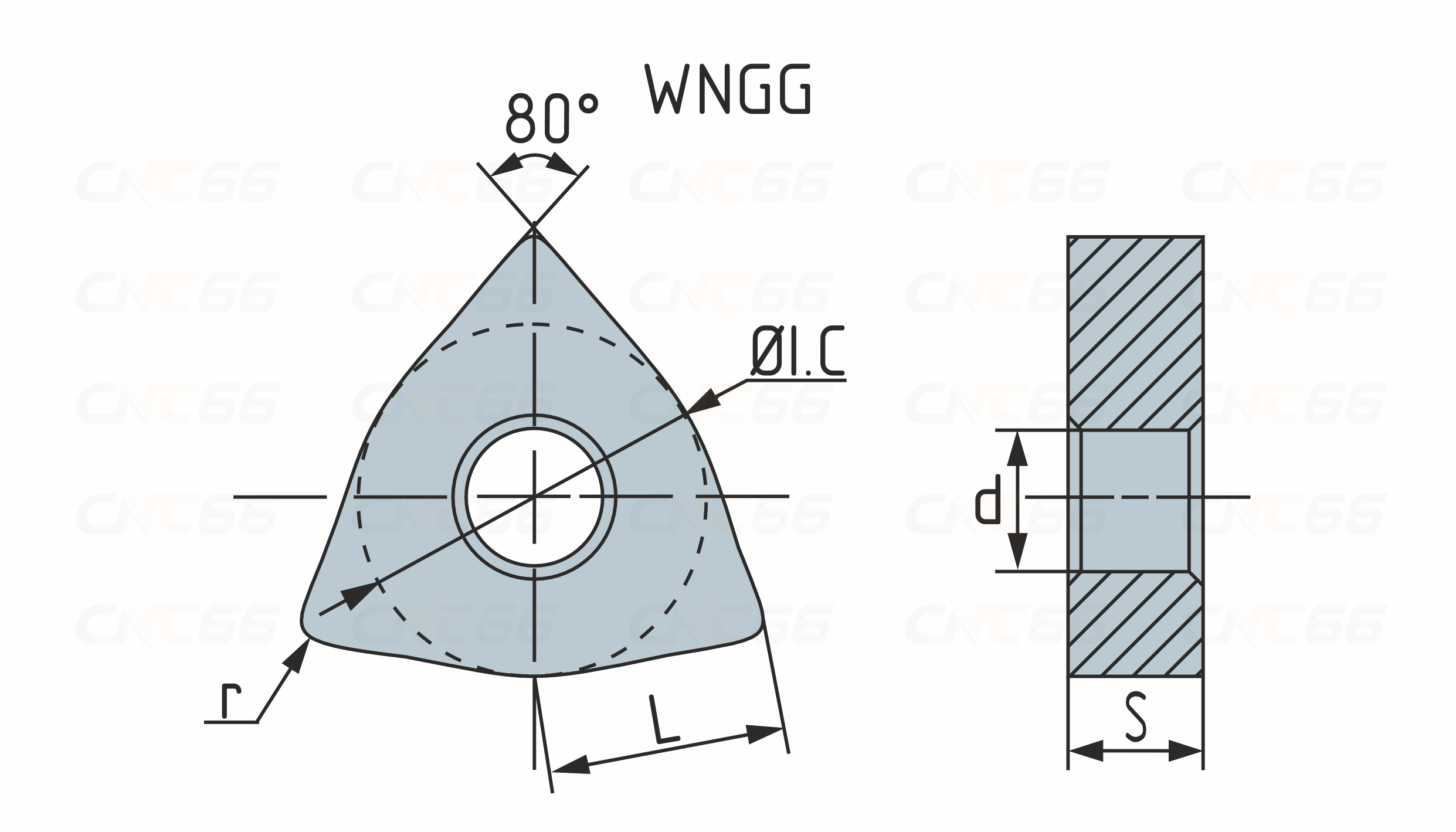 Твердосплавная сменная пластина WNGG для точения по металлу тригональной формы. Пластина двусторонняя со стружколомом, с отверстием. Задний угол 0° (негативная) Допуск: m: D1: 0.025. S1: ±0.13.