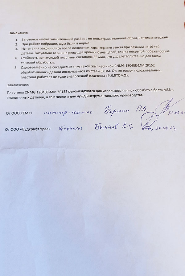 Для подтверждения заявленного качества на ООО «ЕМЗ» в режиме действующего производства в конце августа 2023г. были проведены сравнительные испытания твердосплавных пластин для токарной обработки деталей «Болт» на токарно-винторезном станке с ЧПУ мод.16к20. Условия обработки – ударные нагрузки, корка, облой.