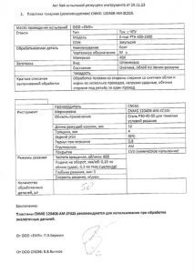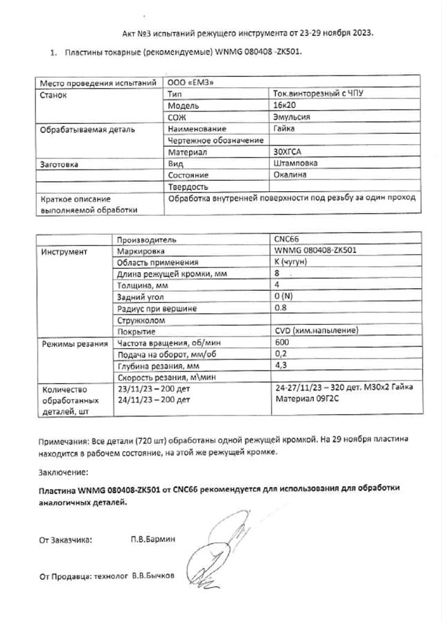 В ноябре 2023 года по договоренности с руководством предприятия были испытаны токарные пластины WNMG080408-ZK501 и CNMG120408-AM-ZC32S. Испытания проходили в режиме действующего производства.
