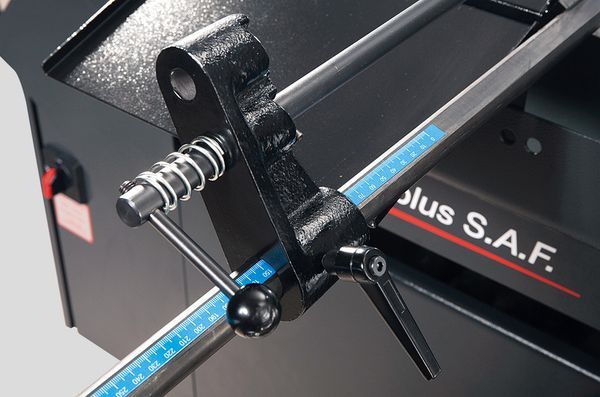 - Упор для выставления заготовок со шкалой, длинной 500 мм в базовой комплектации. Предусмотренное конструкцией «свисание» отрезаемой части заготовки предотвращает заклинивание пилы в материале.