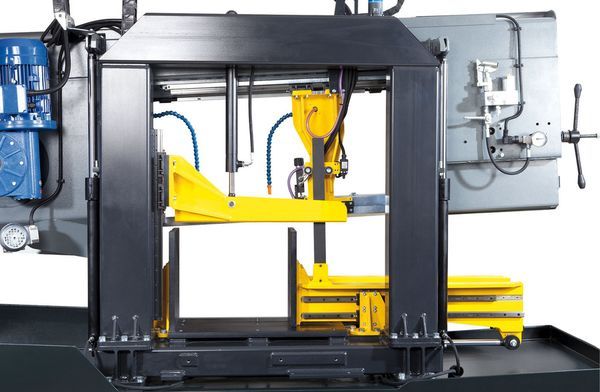Оптимальный зажим заготовки при пилении реализован за счет использования длинноходных тисков, зажимающих заготовку, с обеих сторон от реза. Перемещение тисков происходит по линейным направляющим. Подвижная направляющая пилы перемещается синхронно с губками тисков, что обеспечивает минимальный зазор между направляющей и заготовкой и, как результат, высокую скорость и точность пропила. Перемещение блока также происходит по линейным направляющим. Полный цикл пиления запускается при нажатии одной кнопки – происходит зажим материала, включение вращения пилы и подачи СОЖ, распила, выключения пилы и СОЖ, подъем рамы в исходное настраиваемое положение и разжим тисков. Управление станком происходит с помощью сенсорного дисплея с простым интуитивным интерфейсом. На дисплее можно задать высоту подъема рамы, в зависимости от размеров заготовок; на нем отображаются количество сделанных резов, режимы на которых происходит пиление, такие как скорость и подача, в мм/мин; нагрузка привода полотна и возможные ошибки, в случае их возникновения. Станок оборудован высокопроизводительным гидроагрегатом, с возможностью регулирования усилия зажима тисков. Все это, при наличии управляемой гидравлической подачи, позволяет получить максимальную производительность, особенно при пилении больших серий или пилении труднообрабатываемых материалов сплошного сечения. Оба блока, направляющие полотно, оснащены гидравлическим устройством автоматического регулирования подачи в процессе реза, что значительно увеличивает точность реза и стойкость инструмента.