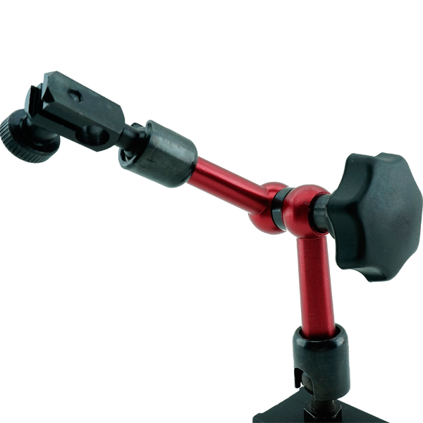Два сферических шарнира в конструкции штатива позволяют быстро разместить измерительную головку в нужном месте. Гидравлическая система плавно увеличивает усилие фиксации шарниров, обеспечивая высокую точность установки. Магнитное основание защищает штатив от случайных перемещений и опрокидывания, а также даёт возможность установки на вертикальных поверхностях. Механизм тонкой подачи позволяет точно выставить направление измерения (перпендикулярно к поверхности измерения).