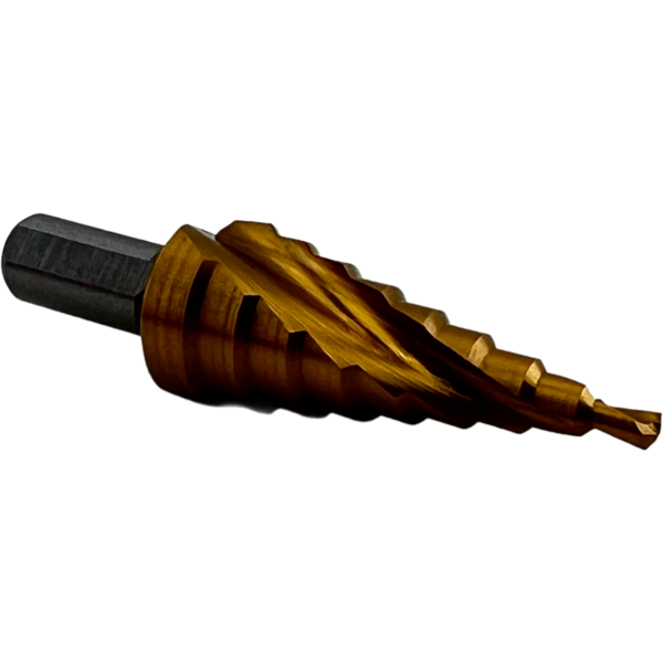 - SSAS-103 Ступенчатое сверло по металлу, спиральная канавка, HSS, TIN (4,6,8,10,12,14,16,18,20 мм)