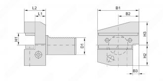 Инструментальный блок VDI THA-B3-4025 используется для фиксации токарных державок (резцов) и применяется для радиальной, продольной наружной обработки. Конструктивное исполнение держателя B3: правое, укороченное, обратное (основная опорная поверхность расположена выше оси вращения шпинделя). Размер VDI: 40 мм. Макс./мин. сечение подходящего резца (H1): 25/20 мм.