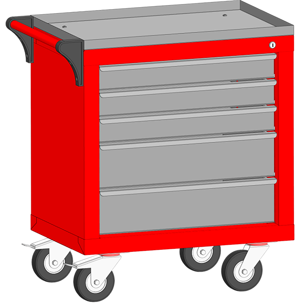 Инструментальная тележка с 5 ящиками полного выдвижения. Три малых и два больших ящика закрываются на общий центральный замок Внутренний размер ящика: 570х400х75/120 мм.